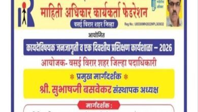 प्रतिनिधी : विरार :नितीन राणे :- पालघर जिल्हा मुख्य प्रतिनिधी नागरिकांना आपल्या कायदेशीर हक्कांची जा…