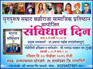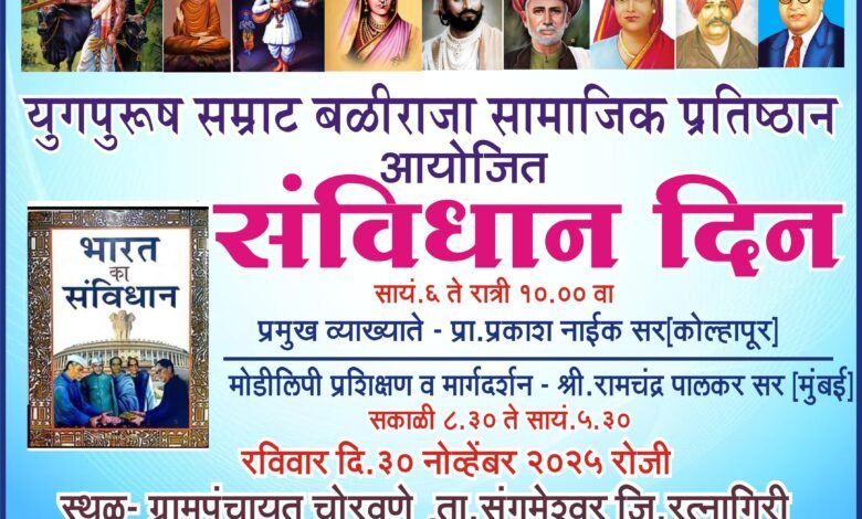 - प्रतिनिधी : संगमेश्वर : प्रमोद तरळ :- युगपुरुष सम्राट बळीराजा सामाजिक प्रतिष्ठानच्या वतीने रविवार दि. ३० नोव्हेंबर २०२५ रोजी सायं ६.०० ते रात्री १०.०० वाजता संविधान दिनाचे आयोजन करण्यात आले आहे.