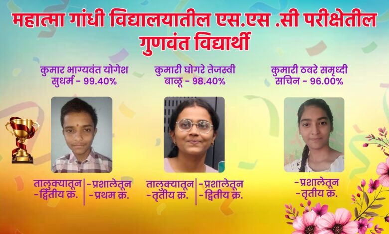 महात्मा गांधी विद्यालयाची यशाची परंपरा कायम. 13/ 5 /2025 रोजी माध्यमिक शालांत प्रमाणपत्र परीक्षा मार्च 2024-25 चा निकाल ऑनलाईन जाहीर झालाा.
