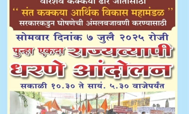 - संत कक्कया आर्थिक विकास महामंडळ स्थापन व्हावे म्ह णून वीरशैव कक्कय्या कल्याण मंडळ मुंबई, मार्फत मागी ल वर्षी २८/६/२४ रोजी धरणे अंदोलन आयोजित केले होते.