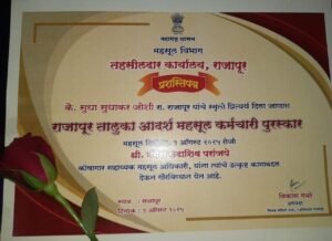 - त्यानुसार सन २०२४-२५ करीता पहिल्या वर्षीचा पुरस्कार राजापूर तहसीलदार कार्यालयात कोषागार सहाय्यक मह सूल अधिकारी पदावर कार्यरत मंगेश परांजपे यांना एक आँगस्ट म्हणजेच महसूल दिनी राजापूर तालुका आदर्श महसूल कर्मचारी पुरस्कार देऊन गौरविण्यात आले.