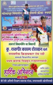 कोल्हापूर विभागीय क्रिडा स्पर्धेत उंच उडी क्रिडाप्रकारात प्रभानवल्ली हायस्कूलचा कु.दस्तगीर कासम शेरखान चमकला.