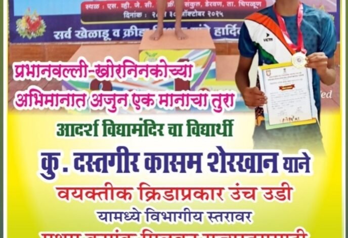 - यामध्ये श्री देवी अदिष्टी शिक्षण प्रसारक मंडळ प्रभानव ल्ली खोरणीनको संचलित आदर्श विद्यामंदिर प्रभानवल्ली चा कुमार दस्तगीर कासम शेरखान याने उंच उडी या क्री डा प्रकारात विभाग स्तरावर प्रथम क्रमांक मिळविला आहे.