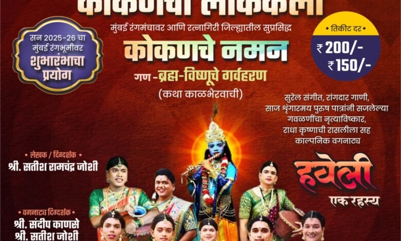 • गेली ३७ वर्षे मुंबईच्या रंगमंचावर गाजत असलेले आणि रसिक प्रेक्षकांच्या मनावर अधिराज्य गाजवत असलेलं सु प्रसिद्ध नमन म्हणजेच श्री.हनुमान भक्त सेवा मंडळ(रजि) निर्मित मु.पो.फणसवळे ता.जि.रत्नागिरी यांचा सन२०२५ -२६ चा शुभारंभाचा प्रयोग गण- ब्रम्ह विष्णूचे. गर्वहरण, गौळणीचा नृत्य अविष्कार आणि काल्पनिक वगनाट्य – “हवेली एक रहस्य” अशी नमनकृती सादर होणार आहे.