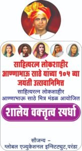 - गटविकास अधिकारी श्री रविंद्र चकोर यांच्या हस्ते प्रतिमे स पुष्पहार अर्पण करण्यात आला, तसेच दिपप्रज्वलन श्री संजय कुमार बनसोडे यांनी केले प्रमुख पाहुणे शिवम ती आशाताई मोरजकर यांच्या अध्यक्षतेखाली साहित्यर त्न लोकशाहीर आण्णाभाऊ साठे यांच्या जीवन चरित्रावर स्पर्धेत 90 विद्यार्थी सहभागी झाले होते.