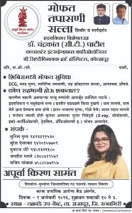 - सिध्दीविनायक हाॅस्पीटल चे हृदयविकार विशेष तज्ञ डॉ चंद्रकांत पाटील रुग्णांची तपासणी करून मार्गदर्शन कर णार आहेत.