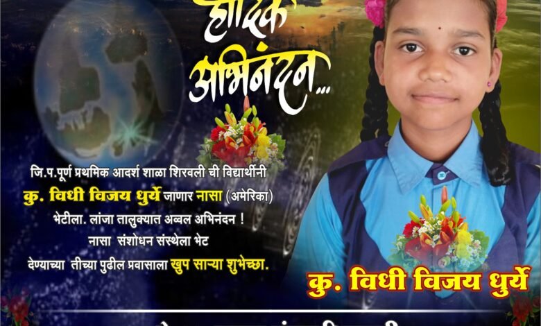• प्रतिनिधी : लांजा : प्रमोद तरळ :-रत्नागिरी जिल्हा परि षदेने नासा, इस्रो भेटीसाठी घेतलेल्या अंतिम परीक्षेत जि ल्हा परिषद पूर्ण प्राथमिक आदर्श शाळा शिरवलीची विद्या र्थिनी कुमारी विधि विजय धूर्ये हिने उज्वल यश प्राप्त क रून लांजा तालुक्यातून नासा व इस्रो या अंतराळ संशोध न संस्थांना भेटी देण्यासाठी जाण्याचा बहुमान पटकवल्या बद्दल तिचे सर्वत्र कौतुक होत आहे.