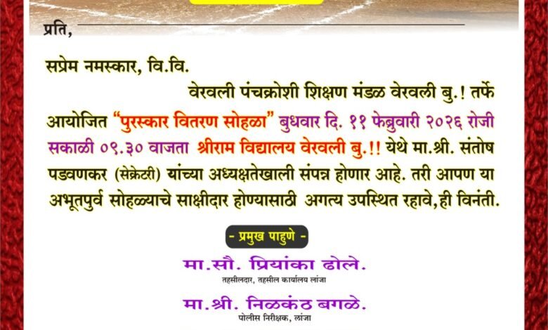 - या सर्व सत्कारमूर्तींचे कौतुक करण्यासाठी बहुसंख्येने उपस्थित राहावे असे आवाहन वेरवली पंचकोशी शिक्षण मंडळातर्फे करण्यात आले आहे.