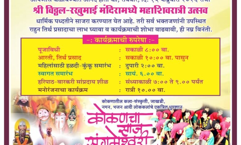 • प्रतिनिधी : राजापूर : प्रमोद तरळ :-तालुक्यातील मौजे फुपेरे भोवडवाडी येथील श्री विठ्ठल रखुमाई मंदिरामध्ये रविवार दि.१५ फेब्रुवारी २०२६ महाशिवरात्री उत्सवानिमि त्त विविध कार्यक्रमांचे आयोजन करण्यात आले आहे.