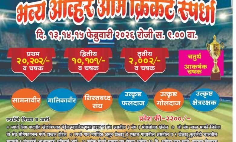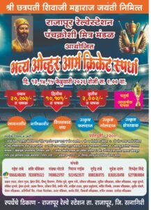 • प्रतिनिधी : प्रमोद तरळ :-श्री.छत्रपती शिवाजी महाराज जयंतीचे औचित्य साधून दि. १३,१४ व १५ फेब्रुवारी २०२६ रोजी सकाळी ९ वाजता राजापूर रेल्वे स्टेशन पंच क्रोशी मित्र मंडळाच्या वतीने भव्य ओव्हरआर्म क्रिकेट स्प र्धेचे आयोजन करण्यात आले आहे.
