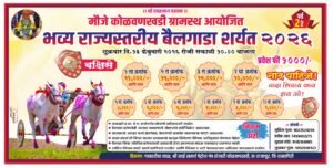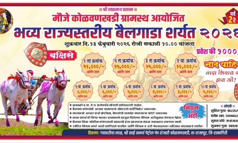 - प्रतिनिधी : राजापूर : प्रमोद तरळ :- मौजे कोळवणख डी ग्रामस्थांच्या वतीने शुक्रवार दि १३ फेब्रुवारी २०२६ रोजी गावचरीचा माळ, श्री साई समर्थ पेट्रोल पंप शेजारी कोळवणखडी, ता राजापूर येथे सकाळी १० वाजता राज्यस्तरीय बैलगाडा शर्यतीचे आयोजन करण्यात आले आहे.