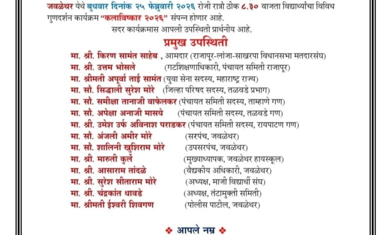 - प्रतिनिधी : राजापूर : प्रमोद तरळ :-जिल्हा परिषद पूर्ण प्राथमिक आदर्श केंद्र शाळा जवळेथर तालुका राजापूर जि.रत्नागिरी येथे मुलांचा विविध गुणदर्शन कार्यक्रम बुध वार दि. २५ फेब्रुवारी २०२६ रोजी आयोजित करण्यात आला आहे.