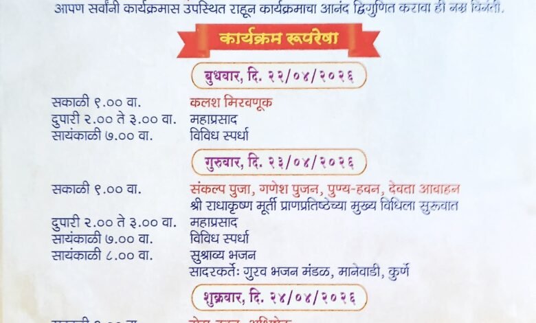 - बुधवार २२ एप्रिल रोजी सकाळी ९ वा. कलश मिरवणूक, दु. २ ते ३ महाप्रसाद, सायं ७ वा. विविध स्पर्धा गुरुवार दि.२३ रोजी स. ९ वा.संकल्प पुजा, गणेश पुजन, पुण्य हवन, देवता आवाहन श्री राधाकृष्ण मूर्ती प्राणप्रतिष्ठेच्या मुख्य विधीला सुरुवात होईल दु. २ ते ३ महाप्रसाद, सायं ७ विविध स्पर्धा, सायं ८ वा. गुरव भजन मंडळ मानेवाडी कुर्णे यांच्या सुश्राव्य भजनाचा कार्यक्रम होणार आहे.