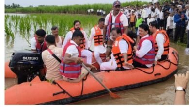 परंडा कारंजा येथील पूर परिस्थितीची उपमुख्यमंत्री एकनाथ शिंदे व पालकमंत्री सरनाईक व डॉ.आमदार तानाजी सावंत यांनी बोटीतून केली पाहणी.