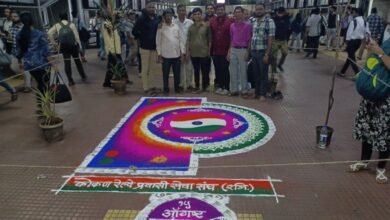 कोकण रेल्वे प्रवासी सेवा संघ यांच्या वतीने ठाणे रेल्वे स्थानकात भव्य रांगोळी.